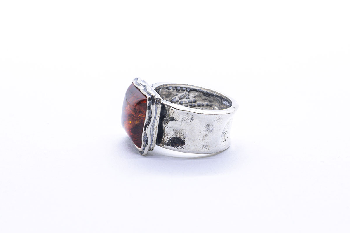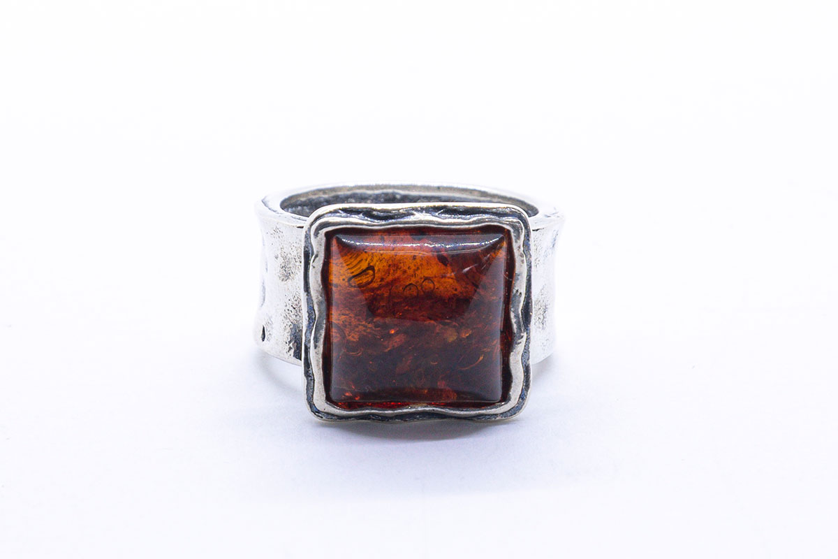 Anillo artesanal en Plata de 1ª Ley, con un aro ancho y una superficie texturizada. El diseño presenta formas orgánicas y un acabado envejecido que resalta los relieves del metal. Al frente, la pieza incorpora un ámbar cuadrado oscuro, con transparencias y vetas internas que crean un efecto cálido y profundo. La piedra está enmarcada por un bisel de plata de borde irregular, que refuerza el estilo artesanal y único del anillo.