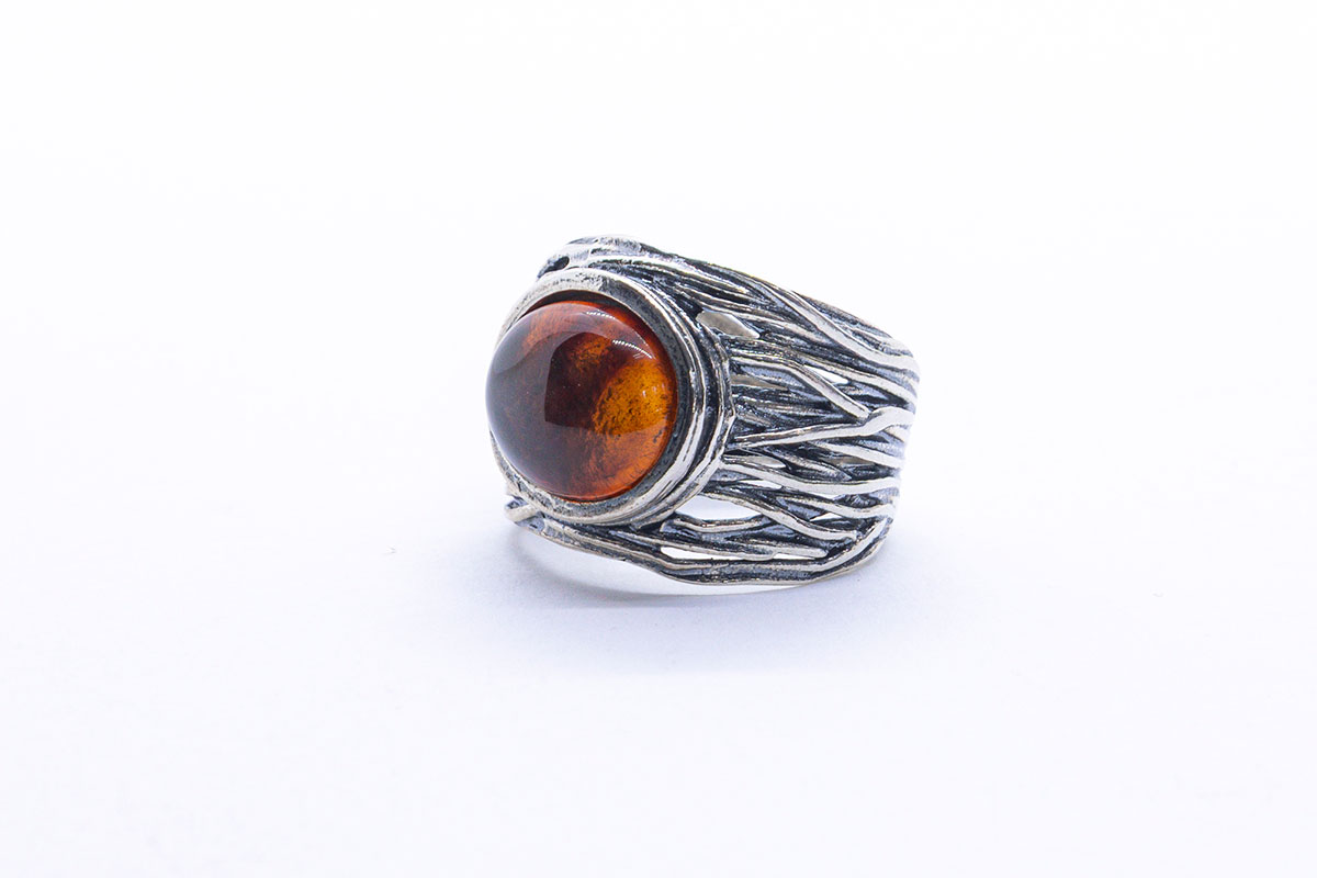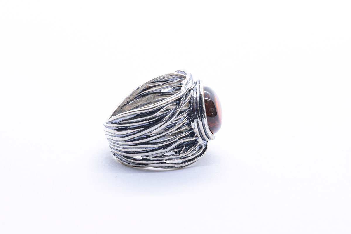 Anillo artesanal en Plata de 1ª Ley, con un diseño muy característico inspirado en formas orgánicas y líneas entrelazadas que recuerdan a fibras o raíces. El aro presenta un acabado envejecido que realza los relieves y aporta un aspecto rústico y artístico. En la parte central destaca una piedra ovalada de ámbar oscuro, con transparencia cálida y reflejos internos que aportan profundidad.