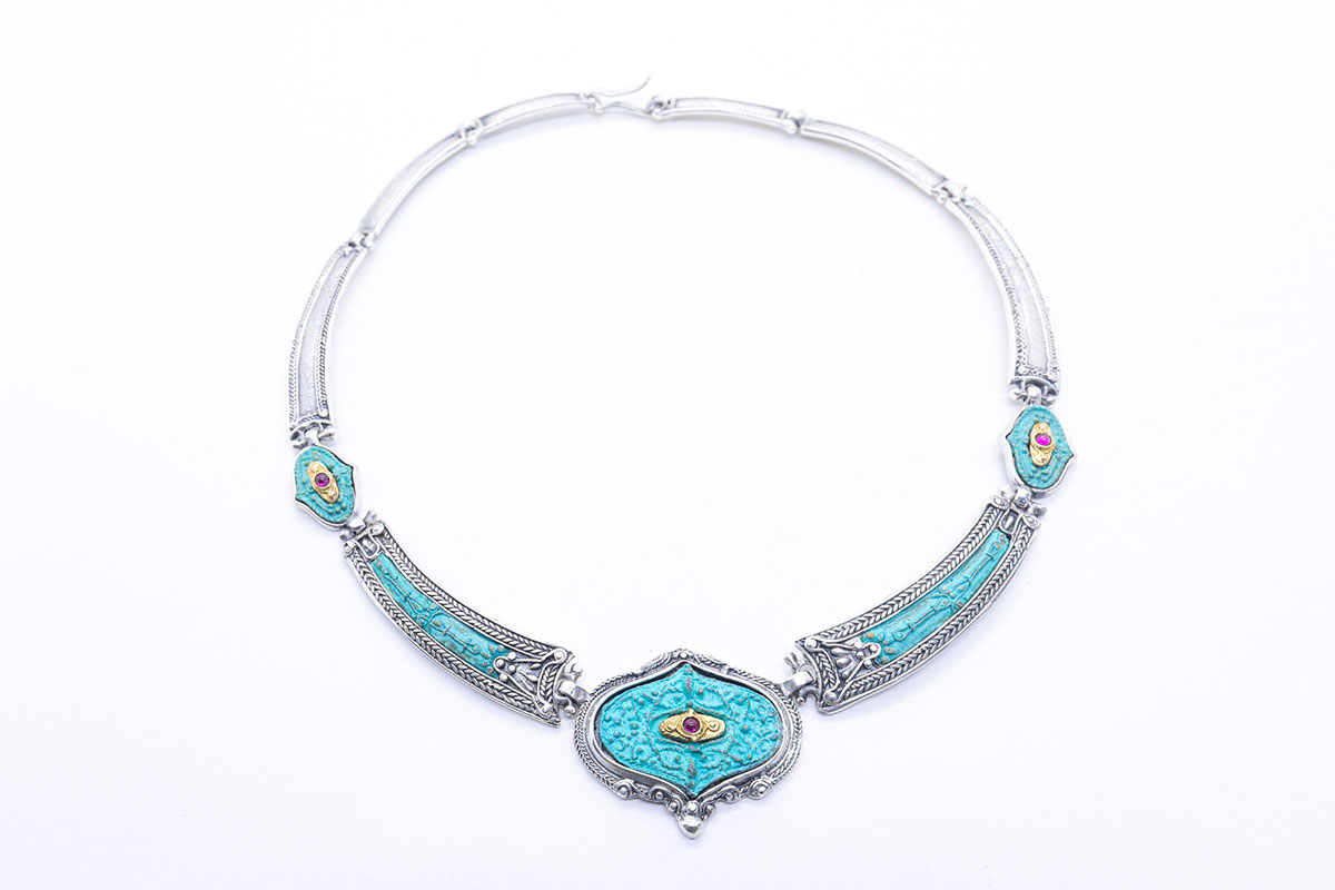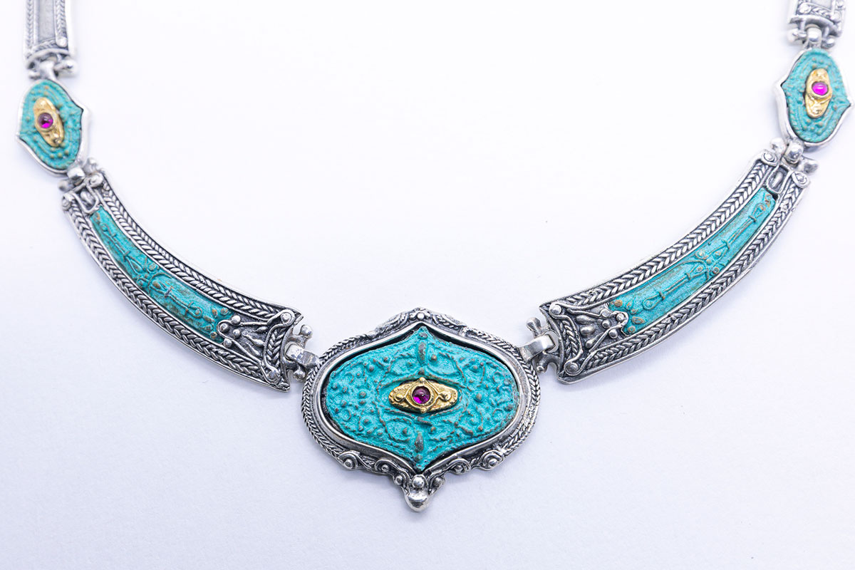Collar de estilo etrusco realizado en plata de ley con eslabones articulados y apliques en bronce oxidado y rubí hidrotermal