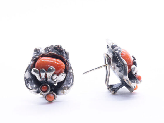 Pendientes de estilo etrusco en forma cuadrada realizados en plata de ley con apliques en bronce oxidado y rubíes hidrotermales.