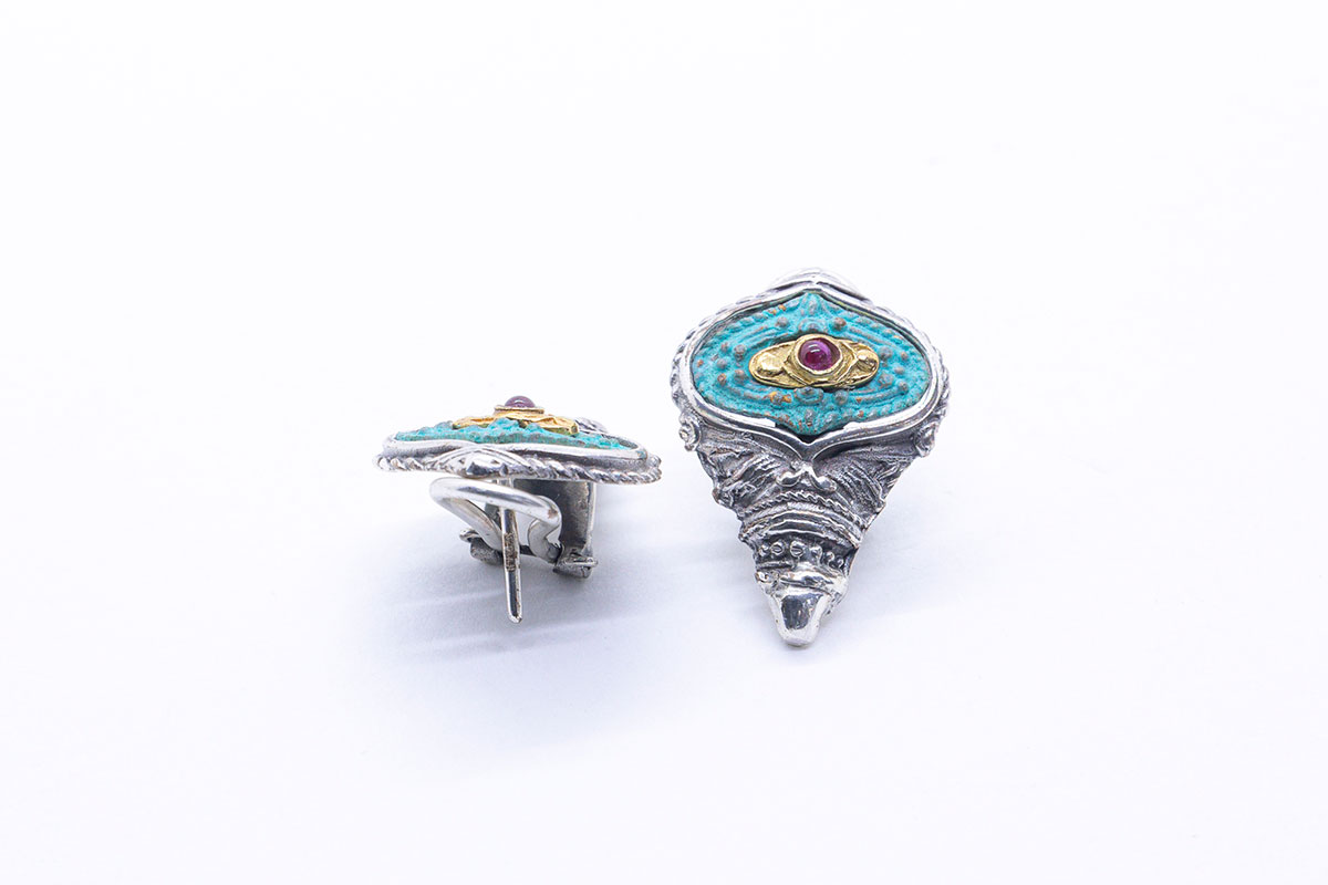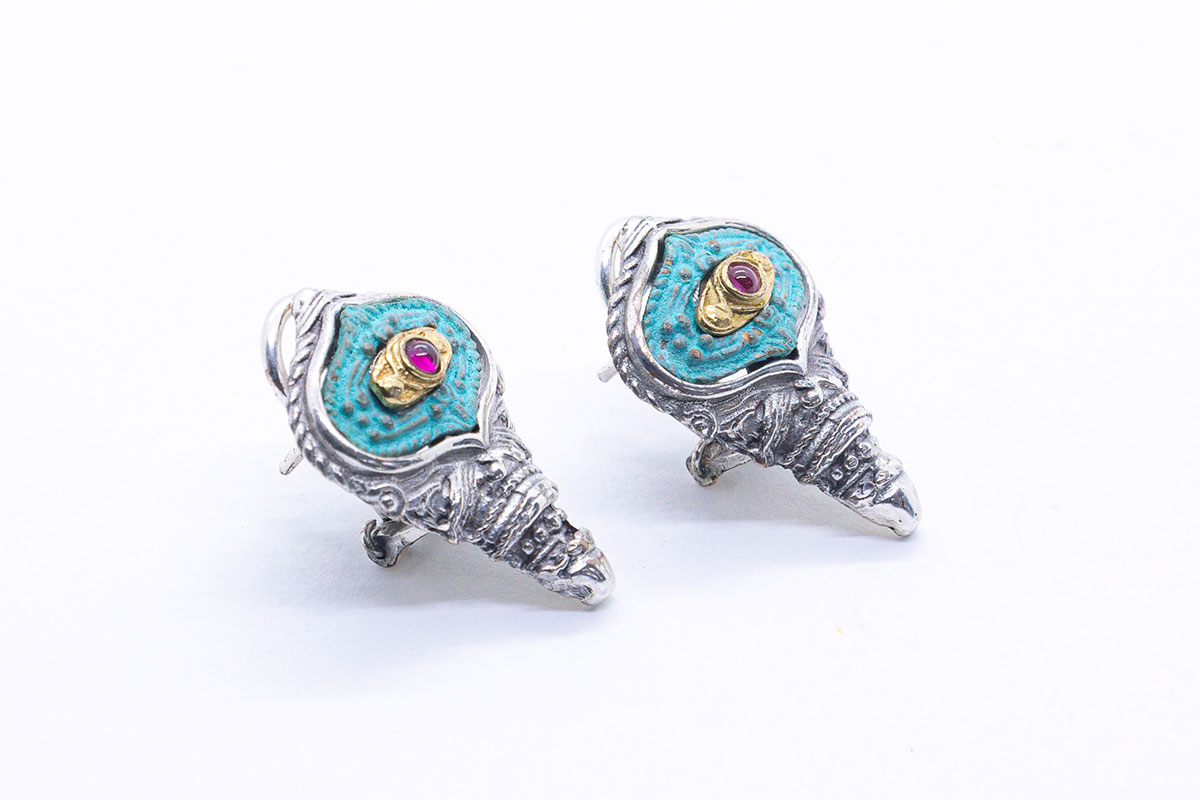 Pendientes de estilo etrusco realizados en plata de ley con apliques en bronce oxidado y rubíes hidrotermales con cierre Omega