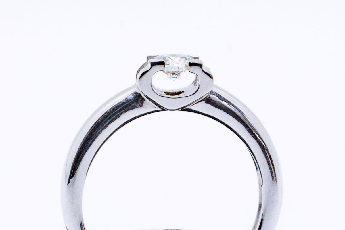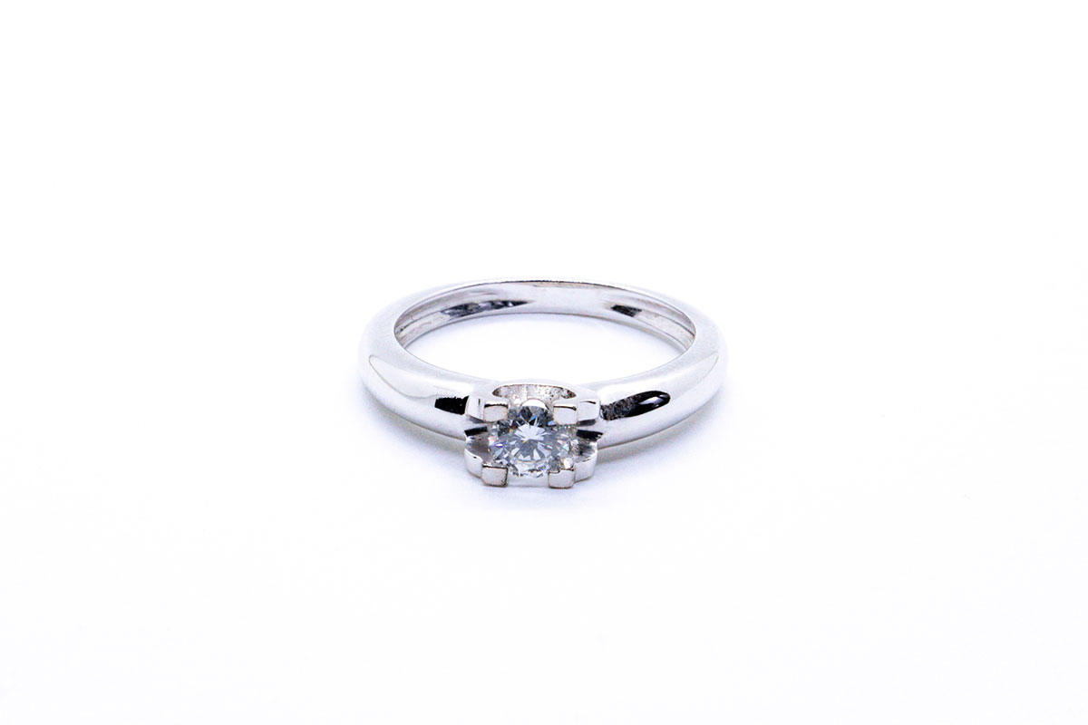 Esta sortija de oro blanco de 18K , compuesta con un diamante en el centro, montada en un engaste discreto que permite que la piedra destaque. El estilo general es moderno, delicado y elegante, ideal para un anillo de compromiso sutil o una joya de uso diario.